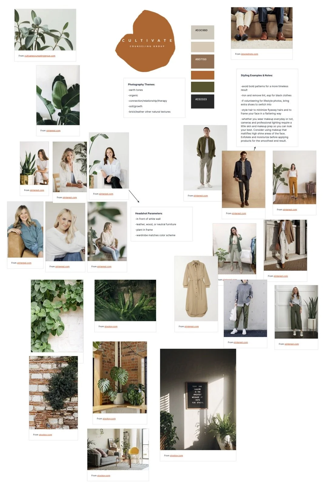After establishing Cultivate Counseling’s visual brand foundation, I developed a mood board, wardrobe styling, and color palette for all photo shoots and provided thoughtful art direction that aligns with their audience.